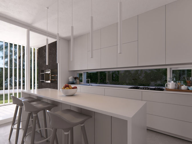 A casa, com fachada e interiores totalmente brancos, se destaca pelo estilo contemporâneo, atemporal e pela leveza visual que valoriza a luz natural.